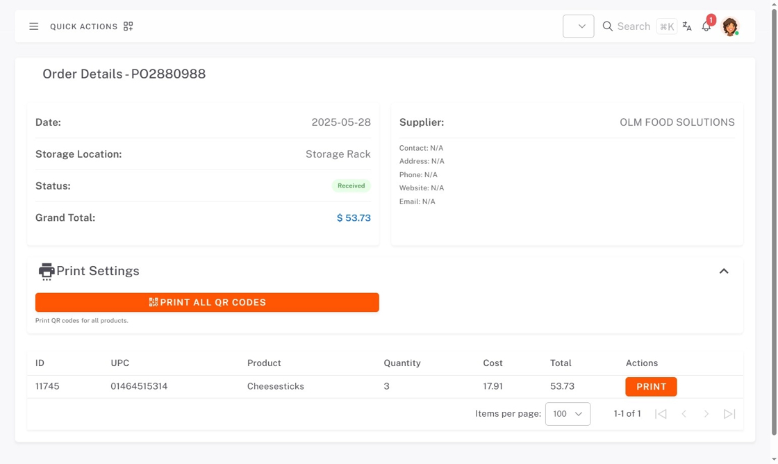9. The page will redirect to Order Details, where you can print product QR code labels if needed.