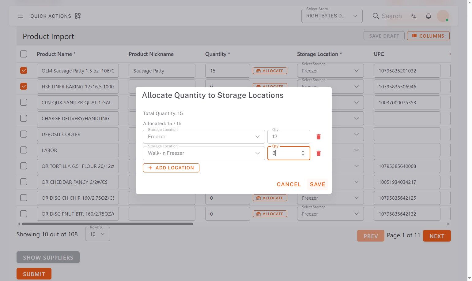 Storage Location: Where the current product quantity is located within the store. Select one storage location from the dropdown, or allocate between multiple storage locations.